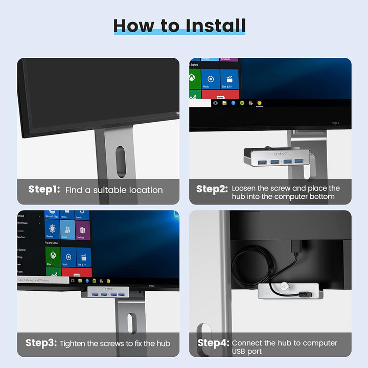 【New Clampable Hub Design】A snap-on 4 port USB 3.0 hub with back clip, you can fix the hub in a straighter position as you like, and use the clip to fix it on the desktop, nightstand or the side of the monitor, save your desktop space better and the clip spacing is 0.2in-1.2in. (Tip: Please measure the thickness of the table or monitor before purchase. Curved surfaces with rounded edges and large arcs may not be easy to tighten.)